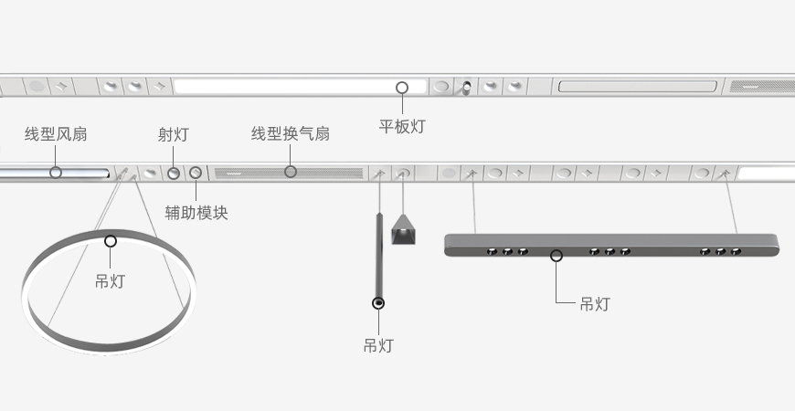 照明、電器、風扇等多品類組件在FreeX組合燈一線之上自由組合,你的頂面生態你做主。