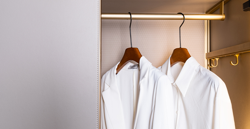 柜內線燈位于立柱槽口向內照射,不刺眼,且光線不會被懸掛的衣物等收納物品遮擋,方便物品的取用。